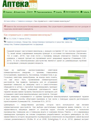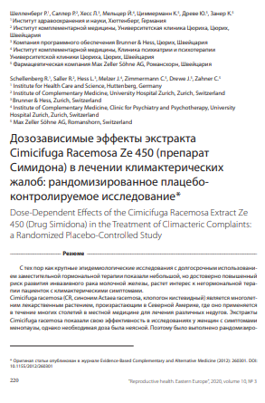 Дозозалежні ефекти екстракту Cimicifuga Racemosa Ze 450 (препарат Сімідона форте) у лікуванні клімактеричних скарг: рандомізоване плацебо контрольоване дослідження.» Reproductive health. Eastern Europe», 2020, volume 10 № 3.